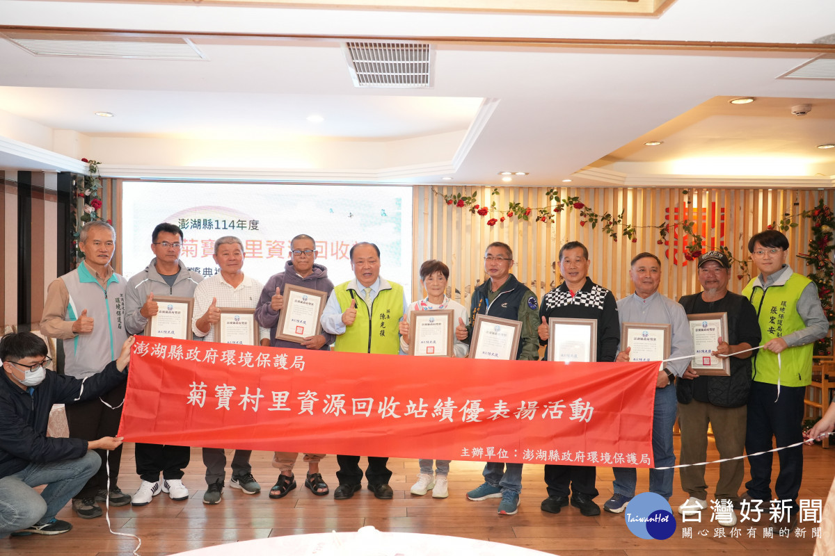澎湖縣政府11日舉行「114年菊寶村里資收站績優表揚活動」,由縣長陳光復親自頒獎,表揚7個績優站點及1個最佳進步站點,肯定村里環保夥伴在資源回收推動與海洋永續上的貢獻。