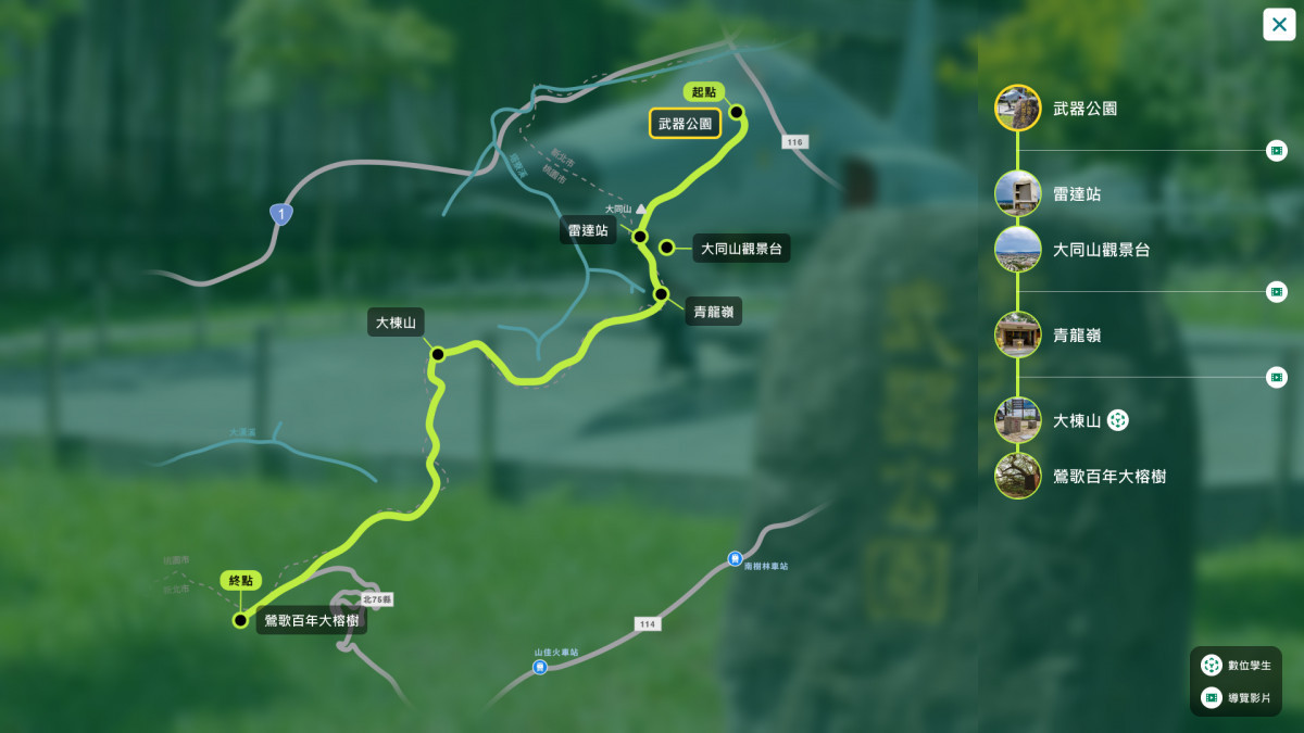 此次數位建模系統以8.9公里的大棟山縱走路線為核心,從樹林武器公園出發,途經雷達站、大同山觀景台、青龍嶺等特色景點,終點抵達鶯歌百年大榕樹,完整記錄這條兼具自然生態與都會景觀的親民步道。