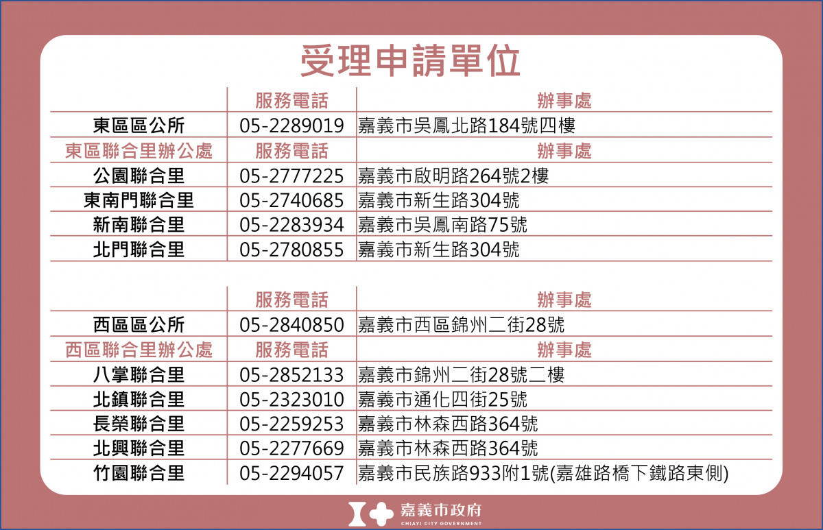 工務處提醒,此次專案慰助金計畫特別修訂公寓大廈之共用部分及專有部分可獨立申請,前已申請本專案慰助之公寓大廈不得重複申請,申請期限自即日起至114年12月31日止,請各管理委員會及住戶儘早提出申請,逾期恕不受理。相關申請書表可至嘉義市政府網站下載(https://www.chiayi.gov.tw/News_Content.aspx?n=464&s=923452),民眾亦可就近向各區公所服務窗口或各聯合里辦公處諮詢或申請。