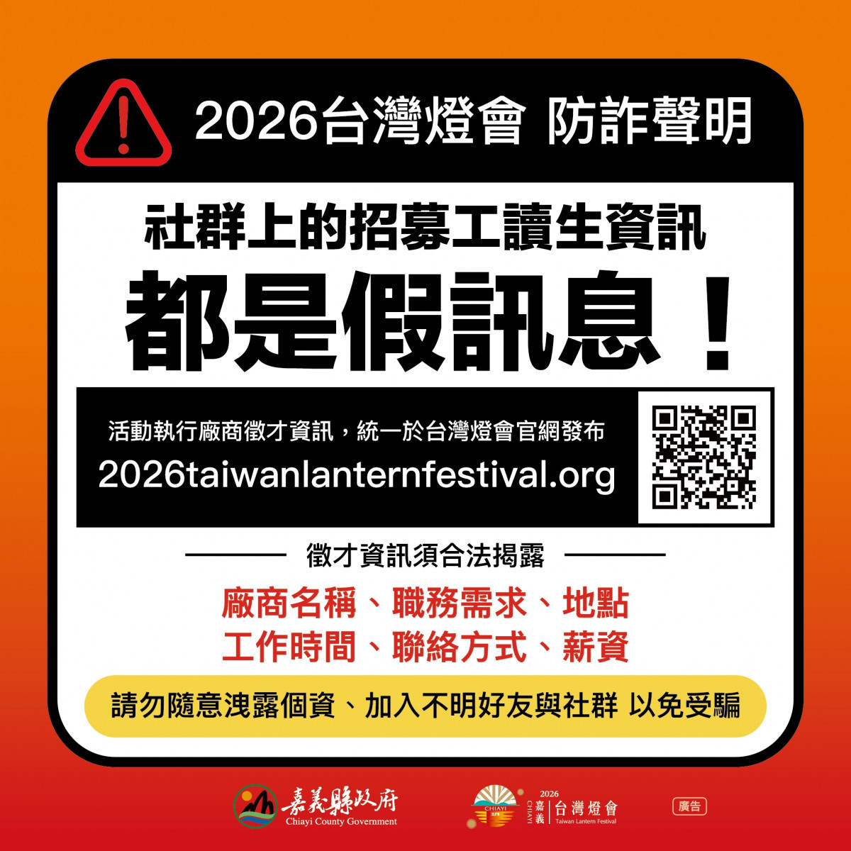 縣府指出,「2026台灣燈會」所有正式徵才資訊,僅會透過「2026台灣燈會官方網站」 https://2026taiwanlanternfestival.org/ 統一公告,不會透過私人社群帳號、不明連結或非官方表單進行徵才。