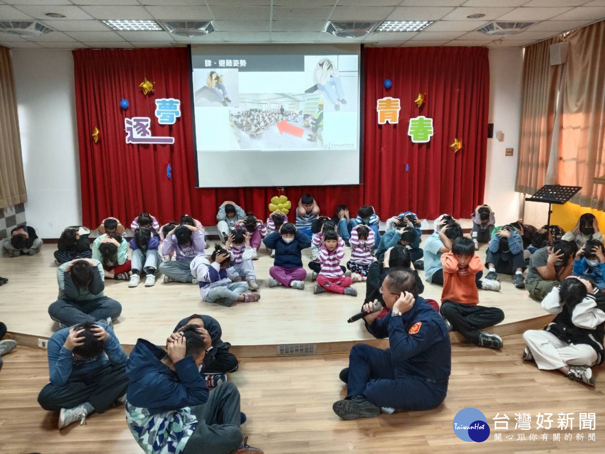 為使宣導更貼近實際情境,彭員在課堂中示範「坐下、掩護、穩住」等基本避難姿勢,並指導全體學生進行操作驗練。學童依口令迅速就位並護住頭部,動作整齊一致,展現優良的演練紀律與反應能力。彭員也逐一協助修正姿勢,確保每位學生都能掌握正確動作,課程緊湊而富教育意義。