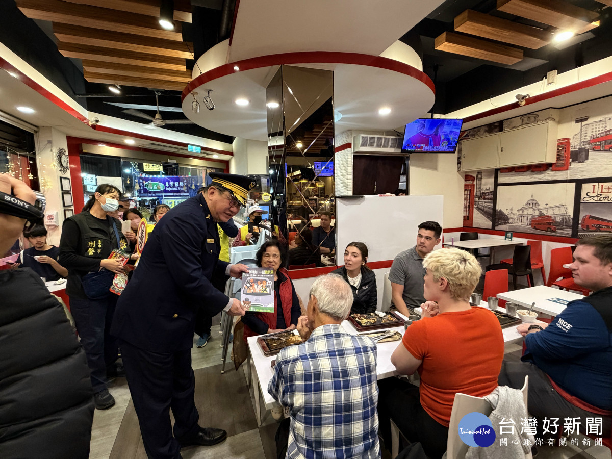 歲末寒意漸濃,大甲鎮瀾宮前的「蔣公路夜市」人聲鼎沸,許多民眾正大啖薑母鴨進補。大甲警分局長蔡期望於十七日晚間親自率隊,深入夜市店家進行複合式宣導。過程中更驚喜巧遇來自美國與日本的觀光客,蔡分局長隨即透過同桌台籍客人進行互動與宣導文宣,讓防詐與酒駕防治教育跨越國界。