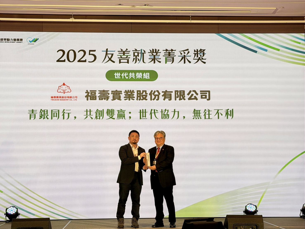 國內百年食品製造商福壽實業(1219)推動友善職場再獲肯定!勞動部勞動力發展署12月22日在台北喜來登大飯店舉辦「2025友善就業菁采獎」頒獎典禮,表揚積極營造中高齡友善就業環境的優異單位。福壽實業今年首度參與評選,憑藉長期推動的「青銀協作模式」與「小老師制度」成果,榮獲「世代共榮組」獎項肯定,展現企業於人才永續經營的制度成果。