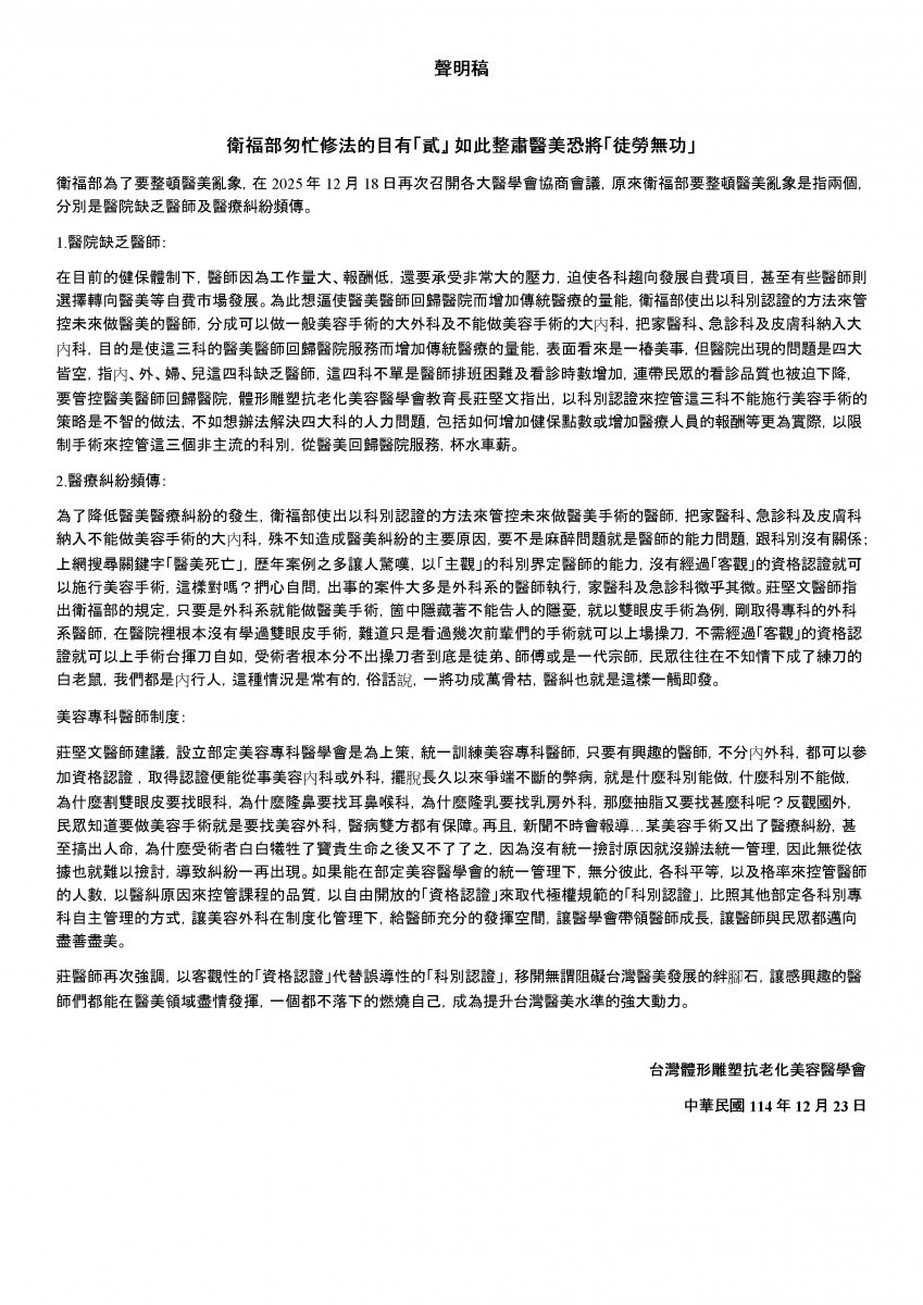 針對國內醫美市場亂象,衛福部於 2025 年 12 月 18 日召開醫學會協商會議,擬透過「科別認證」強制將家庭醫學科、急診科及皮膚科納入「大內科」管理,限制其施行美容手術,意圖藉此引導醫師回歸大型醫院,並降低醫療糾紛。然而,體形雕塑抗老化美容醫學會教育長莊堅文醫師指出,以「主觀科別」界定醫師能力並非良方,不僅無法解決大醫院「四大皆空」的人力荒,更可能讓民眾淪為缺乏專才訓練的「練刀白老鼠」。莊醫師呼籲,應仿效國外建立「部定美容專科」制度,以客觀的資格認證取代極權的科別規範,才能真正保障醫病雙方。