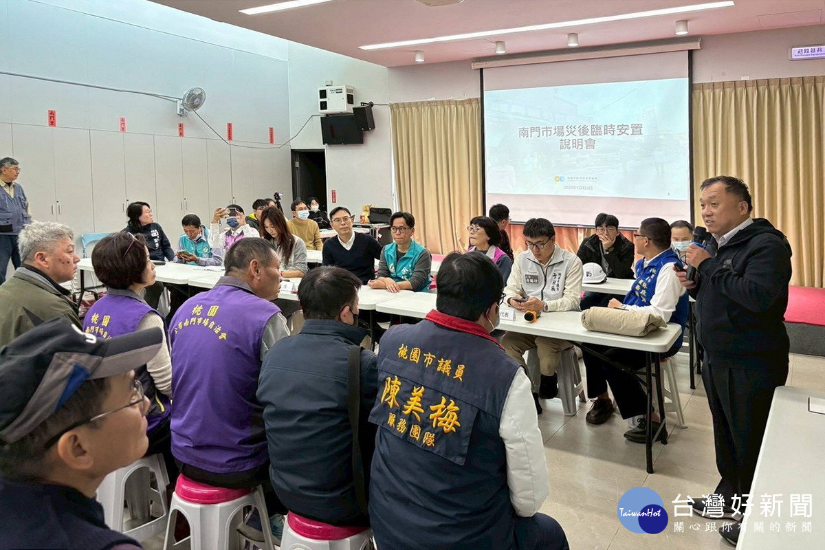 為讓攤商充分了解災後安置與營運安排,市府特別於12月22日召開說明會,向攤商說明臨時攤位規劃。安置對象為南門市場受災之1至7號、52至58號及91至118號攤商,共計42攤,攤位配置將依原有位置安排,以維持市場既有經營動線。臨時攤位設施包含水龍頭、電表、插座、7P開關箱,隔間採水泥板施作,兼顧攤商營運需求與使用安全。