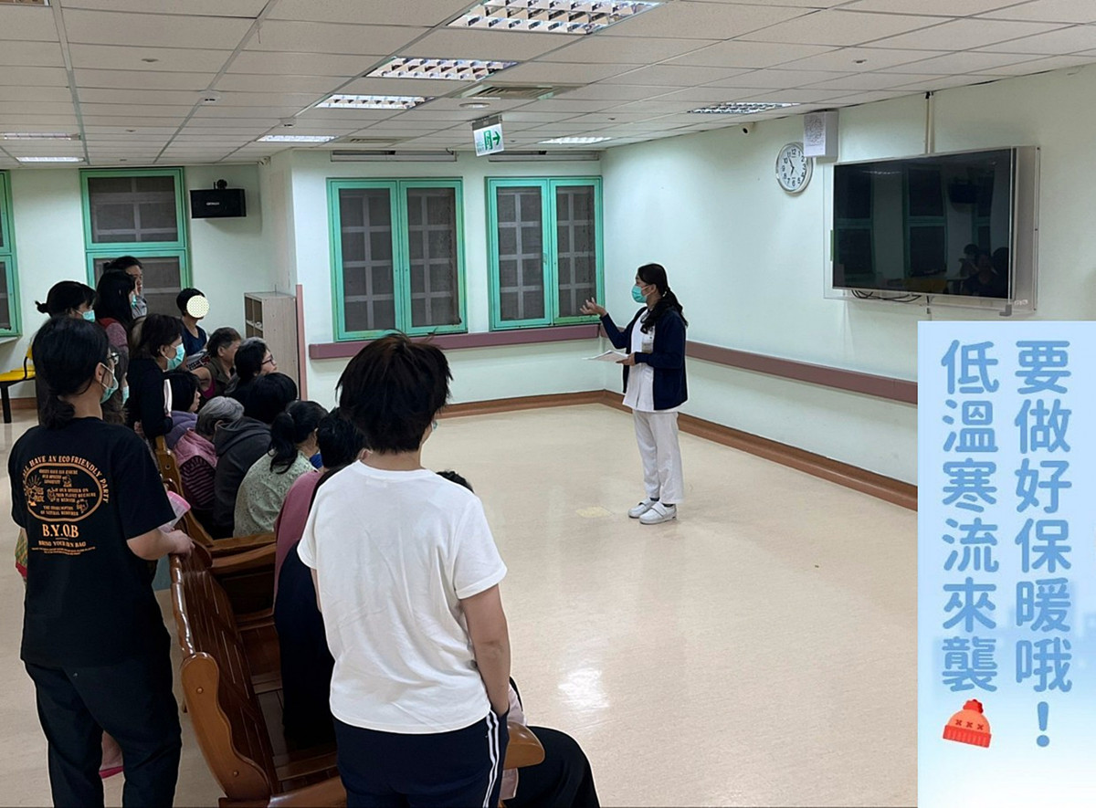 衛生福利部桃園療養院呼籲民眾做好冬日暖心防護,減少心血管疾病發作。隨著季節進入冬季,冷氣團一波一波接著到來,各地氣溫起伏大,在氣溫驟降時會影響民眾日常生活,更是心血管疾病與呼吸道傳染病的高風險期。為守護大眾健康,桃療護理師於門診、病房加強衛教「冬日暖心防護」,呼籲民眾從穿著、飲食及環境三大面向做好防寒準備,平安度過寒冬。
