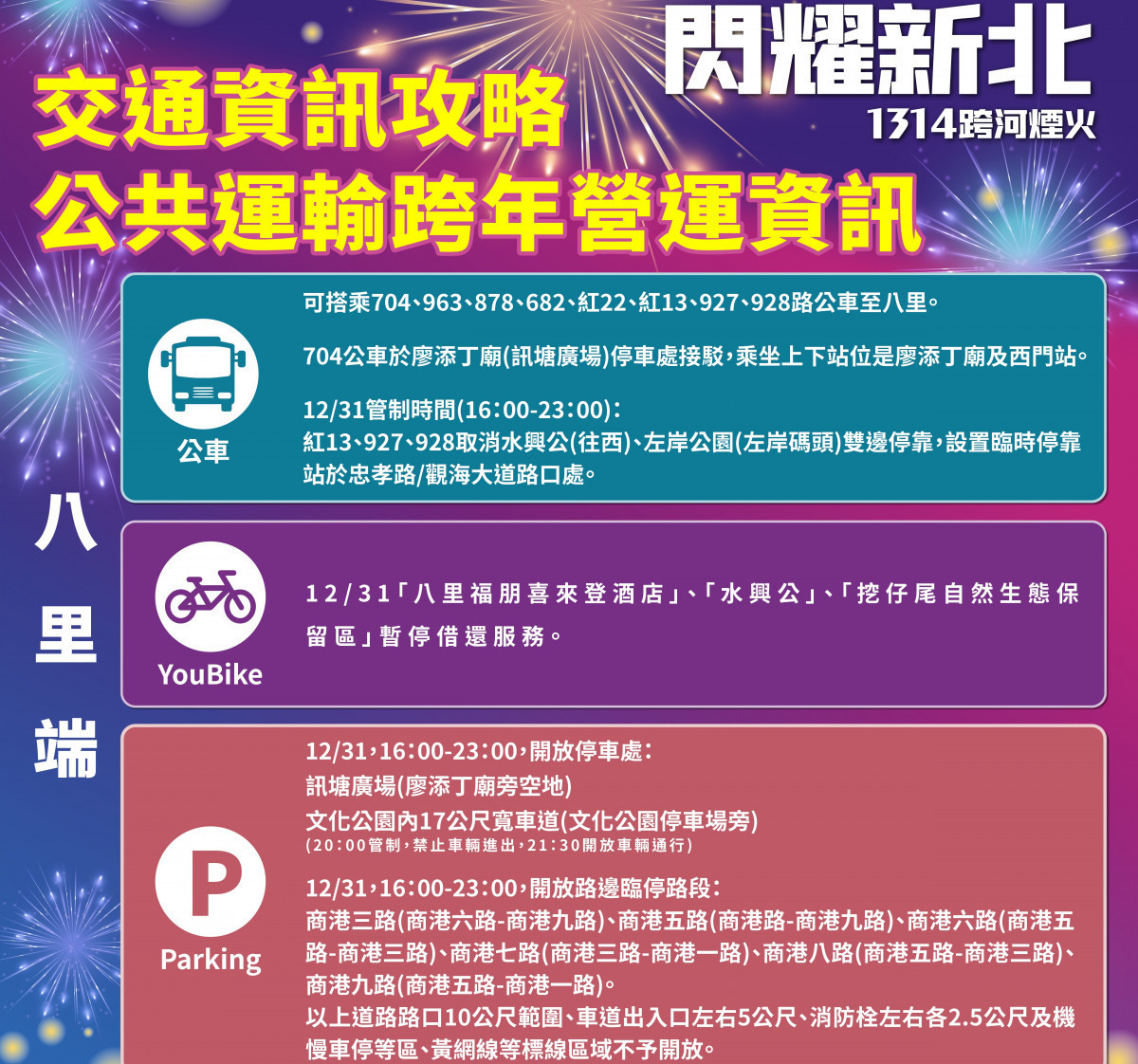 為確保活動順利進行,12月31日下午4點至晚間11點,淡水漁人碼頭及八里左岸周邊將分時、分區實施交通管制。淡水端中正路二段51巷將禁止汽、機車及自行車進入,並配合人潮狀況進行分流引導;八里端亦將視停車場容量與人流狀況,啟動道路封閉與車輛管制措施,請民眾配合現場警義交及工作人員指揮。