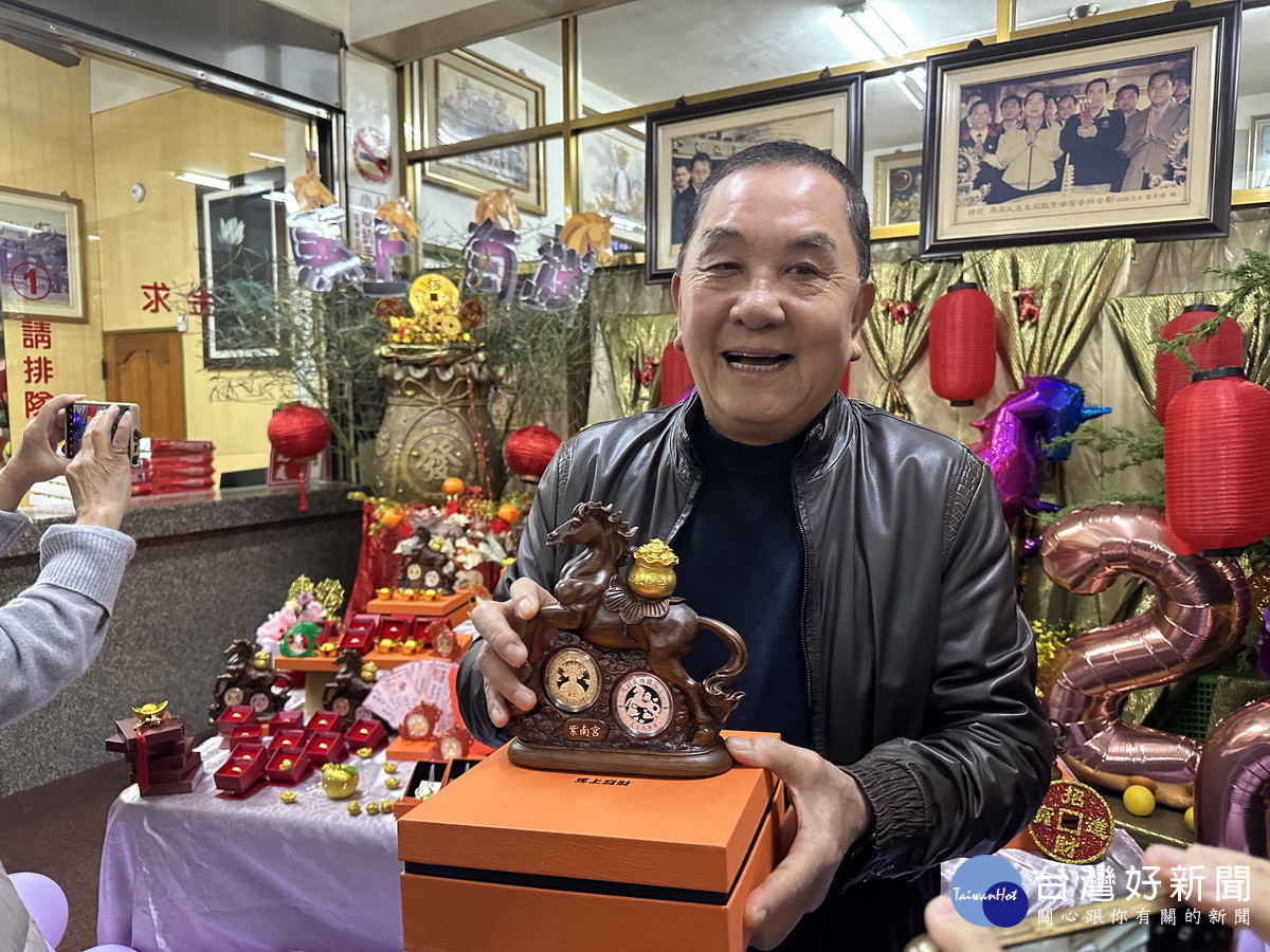 莊主委一早贈送馬年套組給遊客一個大驚喜。(記者扶小萍攝)