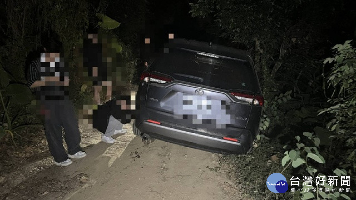 員警到場後發現車輪一深陷泥地,惟目前正值深夜期間拖吊業者均打烊休息,為保險起見先行將黃姓男子等4人載返派出所安置並提供熱食及飲水,待天亮時隨即協助通知業者,最後順利將刁車的自小客車拖出,黃姓男子等人非常感謝警方的熱心幫忙避免受困又夜宿山區。