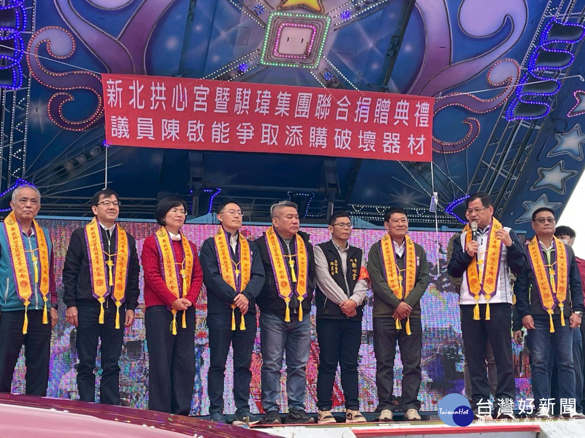 新北市議員陳啟能媒合新北拱心宮暨騏瑋實業有限公司捐贈一輛災情勘查車及破壞器材,消防局今(1)日於三重向日葵廣場舉行捐贈儀式,立法委員李坤城、蘇巧慧及新北市議員李余典、邱婷蔚等出席,消防局長陳崇岳親自主持,向新北拱心宮及騏瑋實業有限公司表達誠摯謝意。