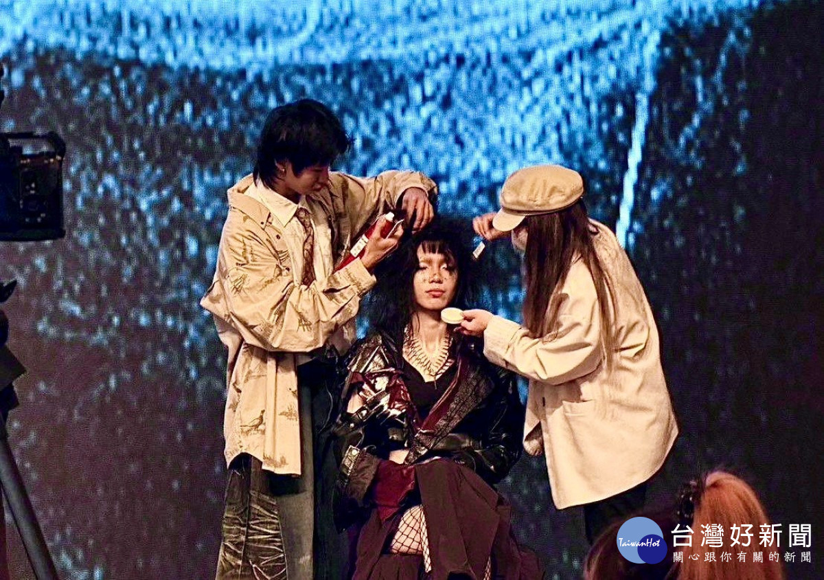 「2025全球髮藝菁英大賞」雙人妝髮接力賽奪冠作品模特兒上台展示。(弘光科大提供)