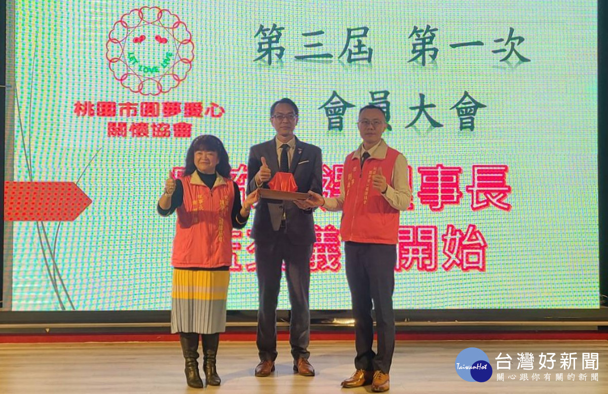 桃園市圓夢愛心關懷協會3日在桃園區鉑宴會館舉辦第三屆第一次會員大會暨新任理事長交接儀式。現任理事長、同時也是創會長的謝慧謹,正式卸下肩上重擔,將職務交棒給新任理事長劉啟吉,場面溫馨隆重。