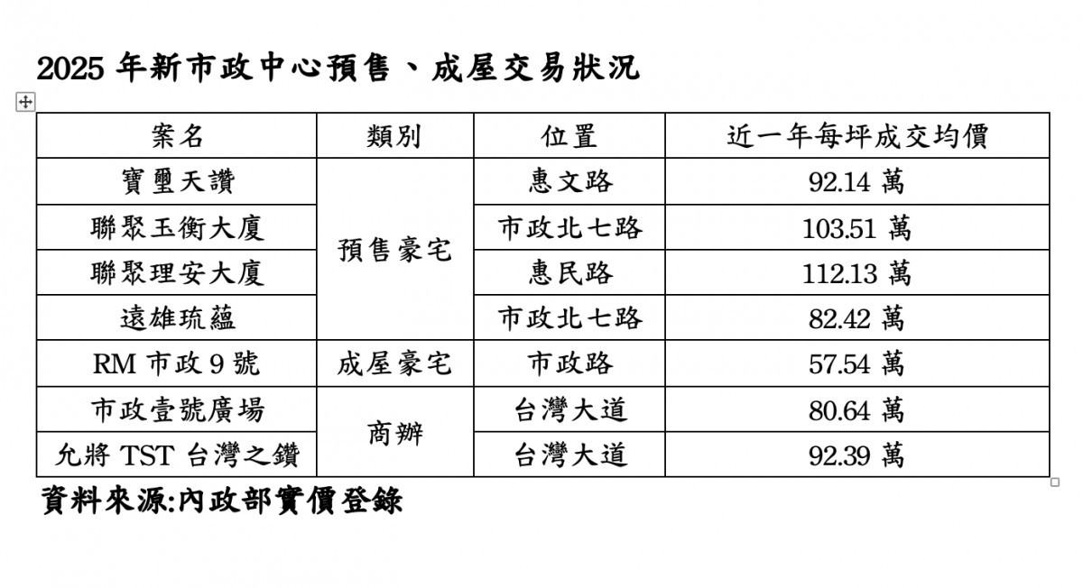 目前品牌建商「聯聚理安大廈」、「聯聚玉衡大廈」每坪單價已突破三位數關卡,寶璽建設位於惠文路的「寶璽天讚」,近一年成交均價達92.14萬元,穩居9字頭前段班;「遠雄琉蘊」均價維持在82.42萬元,意味著七期預售豪宅的「地板價」至少從8字頭起跳,入主新市政中心的門檻大幅提升。