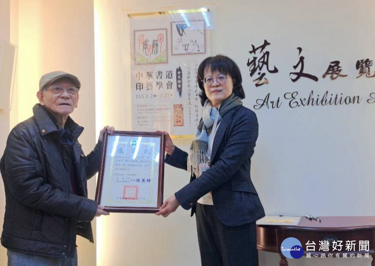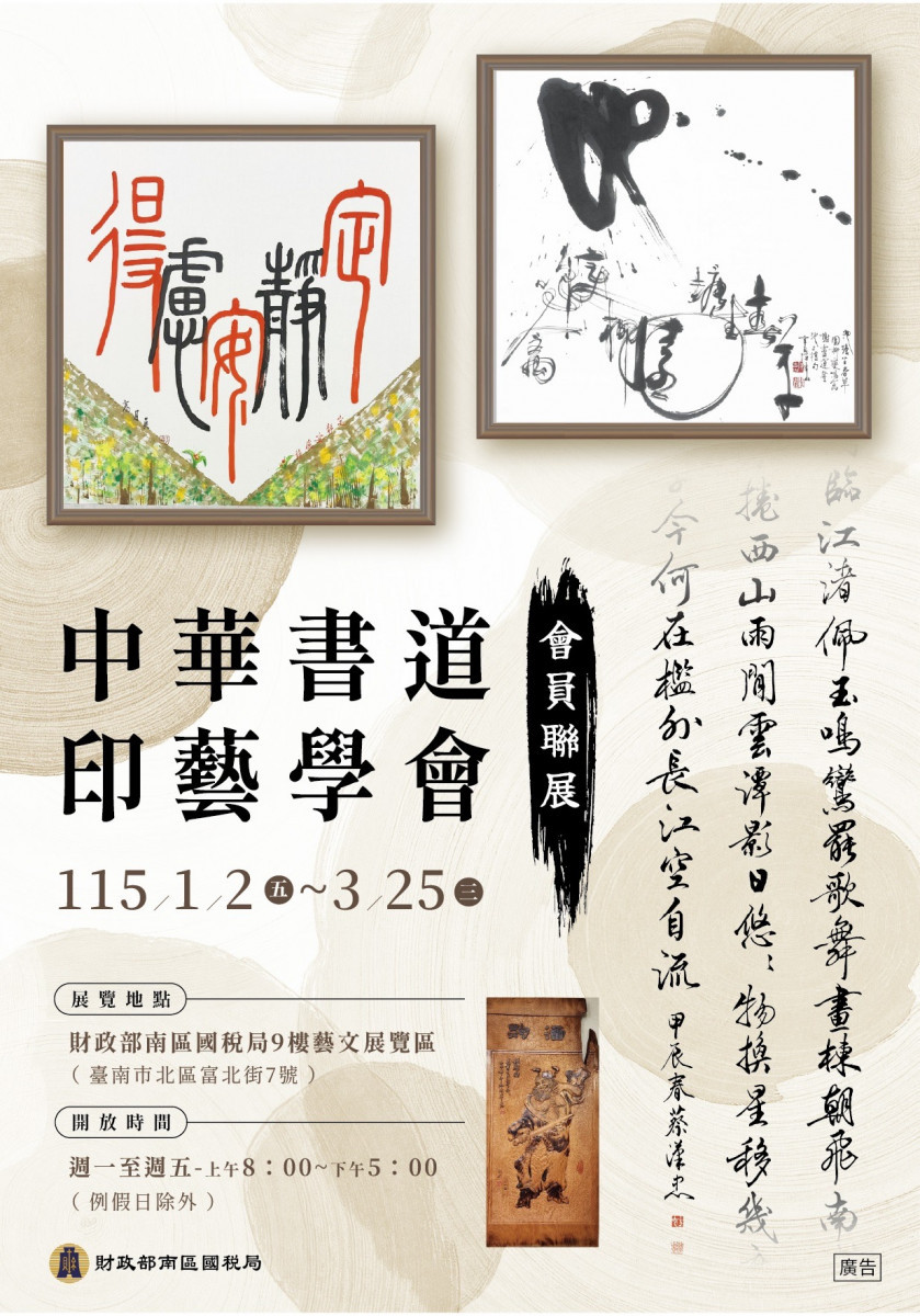 財政部南區國稅局即日起至3月25日止,在該局9樓藝文展覽區展出「中華書道印藝學會聯展」,7日舉行開幕記者會,由南區國稅局是簡任稽核李金芳與中華書道印藝學會理事長陳吉山共同揭幕。