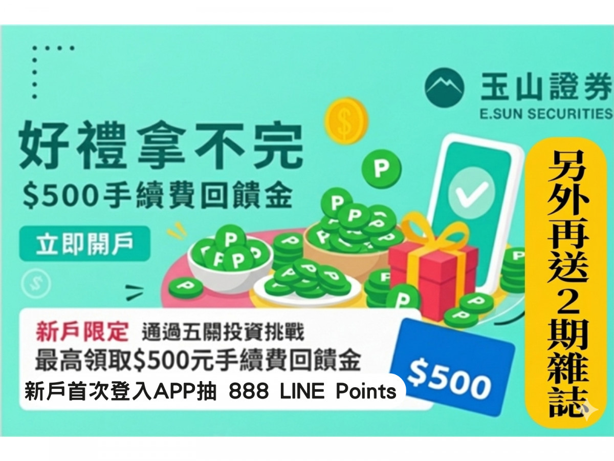 近期玉山證券推出新開戶優惠活動,提供多項豐富的開戶好禮,新戶完成限定5關投資挑戰,最高可領取$500元手續費回饋金;開戶完成,新戶首次登入 APP 抽 888 LINE Points,趁著這波開戶優惠、好禮大放送,開啟你的投資新旅程!