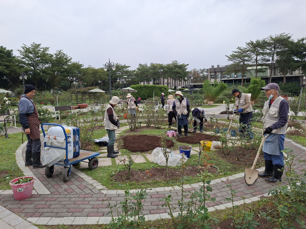 重整體質: 公園處長藍舒凢表示,玫瑰需透過冬季強剪,修除老化與過密枝條,才能促進新芽萌發,讓春天的花朵更飽滿、花量更集中。
