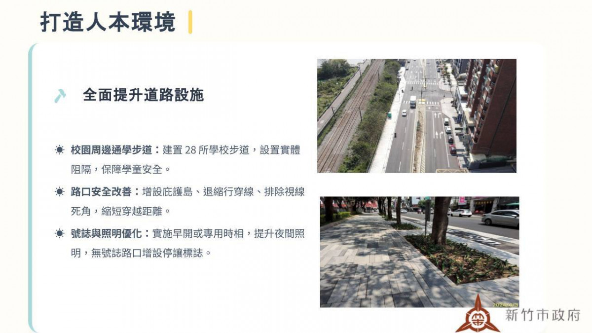 市長高虹安表示,為打造人本交通環境,市府在行人安全方面積極建置28所學校通學步道,並改善路口安全,包括縮短穿越距離、擴大轉角行人空間、設置庇護島與警示設施、排除視線死角、增設行人號誌、檢討秒數並設置早開或專用時相、提升照明,以及設置實體阻隔避免行人違規穿越等措施,全面提升行人過路安全。在無號誌化路口亦增設停讓標誌及標線,提醒用路人注意減速停讓,有效減少事故發生。