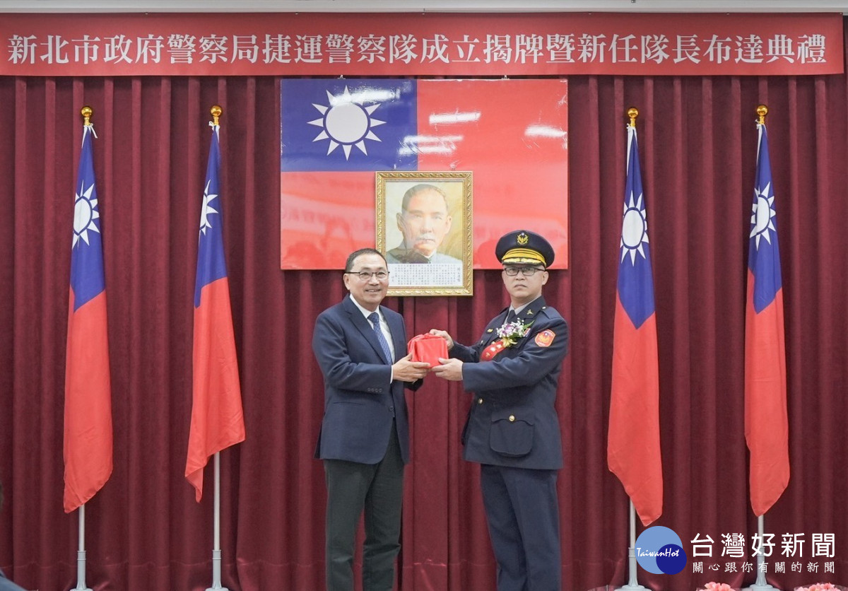 新北市政府為強化捷運系統治安維護與公共運輸安全,今(115)年1月1日成立「新北市政府警察局捷運警察隊」,並於今(13)日正式舉行成立揭牌暨新任隊長布達典禮,市長侯友宜親自主持,並邀請立法委員羅明才、新北市議會蔣根煌議長、陳鴻源副議長、所有市議員、警察局局長方仰寧、新店區區長、轄區里長以及各界貴賓觀禮,共同見證重要時刻,並期勉新任隊長廖國安戮力以赴做好各項捷運治安維護工作。