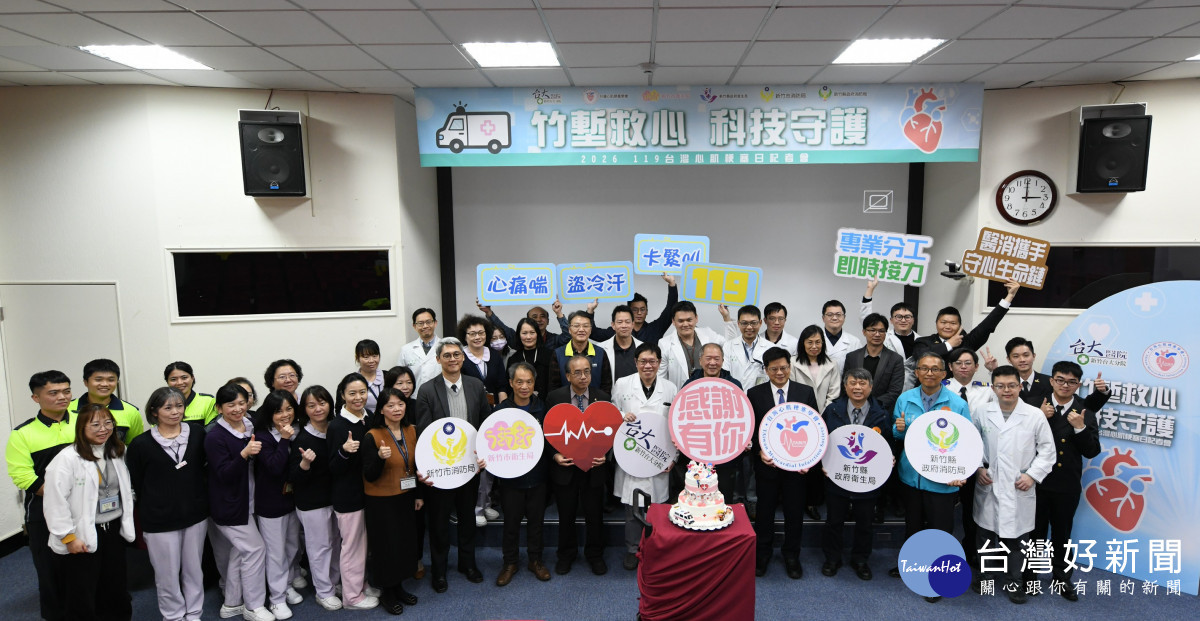響應1月19日「119台灣心肌梗塞日」,為提升民眾對心肌梗塞的警覺與應變能力,新竹臺大分院攜手台灣心肌梗塞學會與中華民國心臟基金會舉辦「竹塹救心,科技守護─2026 119台灣心肌梗塞日記者會」。邀請新竹市衛生局陳厚全局長、消防局陳家慶副局長,以及新竹縣政府衛生局殷東成局長、消防局李立成副局長,台灣心肌梗塞學會黃群耀理事長、黃偉春榮譽理事長共同出席,展現大新竹地區「院前消防、院內醫療」跨域合作守護生命的決心。