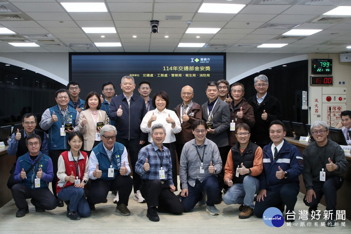 嘉義市政府114年榮獲交通部「金安獎」頒發交通工程組第三組第一名、交通執法組第三組第一名、緊急醫療救護第三組第一名,以及交通安全宣導組第三組第二名等佳績。昨(13)日參與道安考評相關業務單位於市務會議中將獎項轉呈市長黃敏惠,與市府團隊共享榮耀。