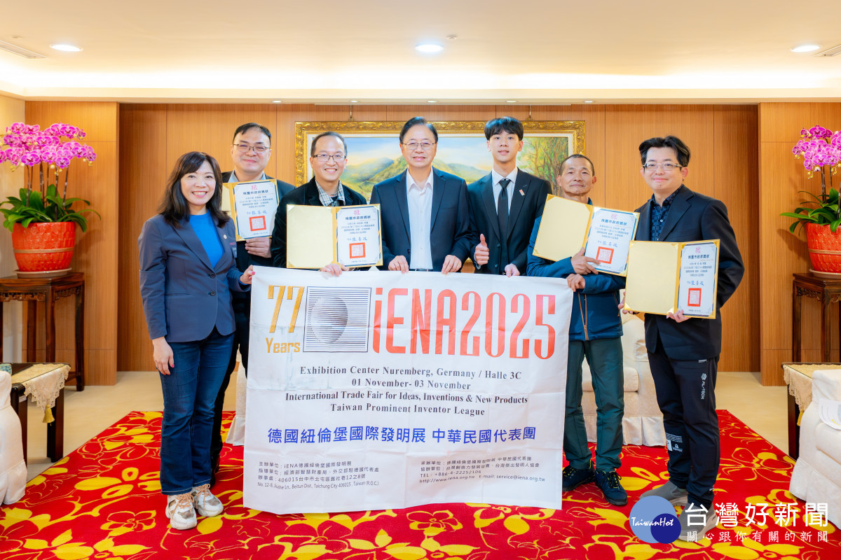 2025年第77屆iENA德國紐倫堡國際發明展傳來捷報,本次臺灣參展團隊共以29件作品參與競賽,於眾多國際競爭中脫穎而出,共榮獲12金、7銀、7銅及德國特別獎,其中桃園中原大學林政鞍教授、張雍教授、林義峯教授、新貴有限公司許新貴等人表現亮眼,共榮獲1面金牌及3面銅牌,成果斐然。桃園市長張善政今(16)日特別接見4件得獎作品之發明人(團隊),肯定其於國際舞台上展現卓越研發實力,為桃園及臺灣爭光。