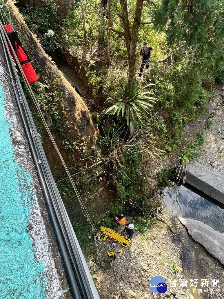 一名青少年騎自行車率落魚池鄉大林橋約12米深橋下。(消防局提供)