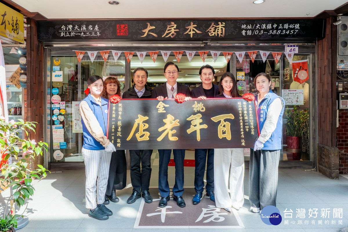 桃園市長張善政20日上午前往大溪區,致贈大房食品股份有限公司「桃金百年老店」匾額,肯定大房豆干持續導入創新思維,將百年工藝與現代經營模式結合,展現老店轉型升級的典範,也期盼藉由今日表揚,帶動本市更多老店投入創新,共同形塑桃園老店品牌新價值。