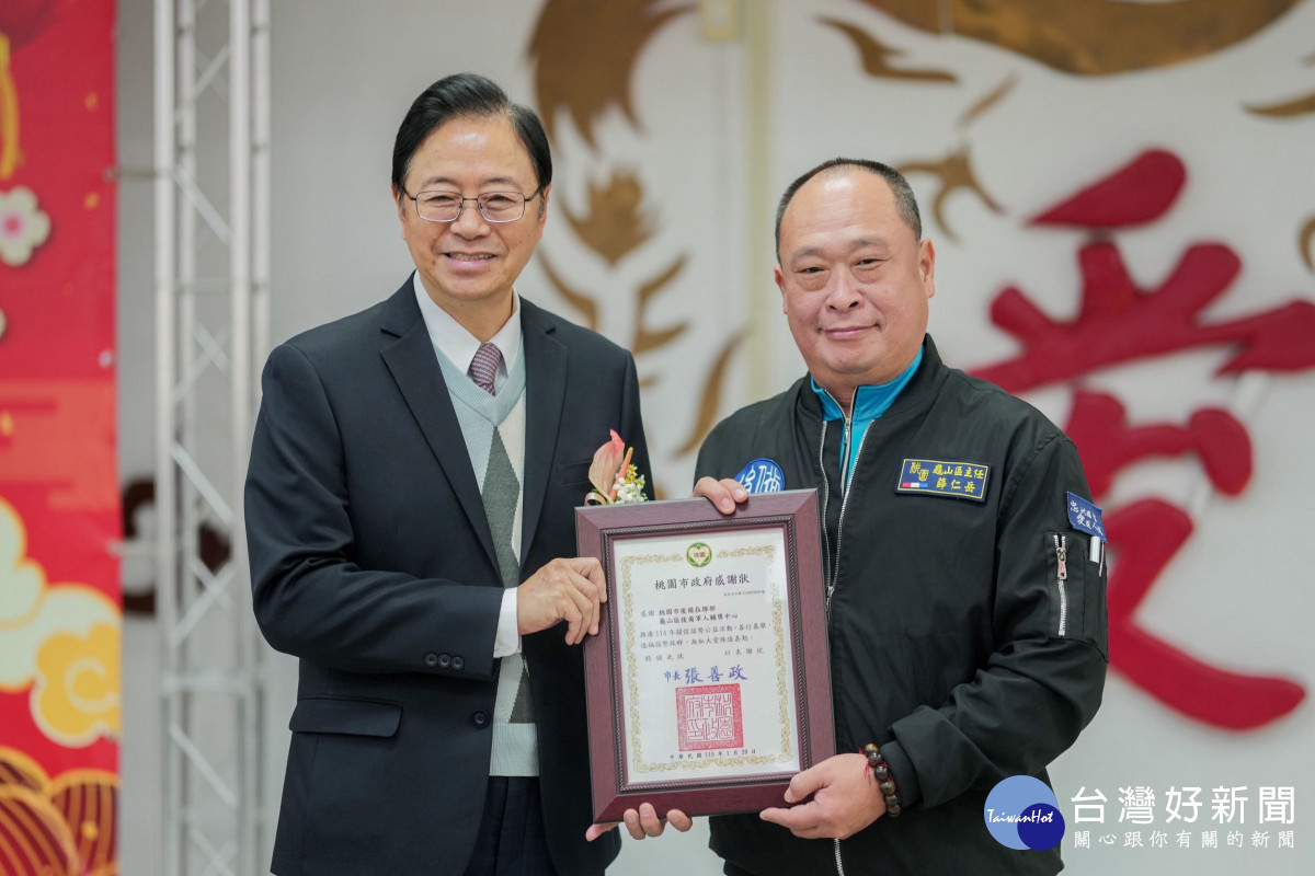 桃園市長張善政20日上午前往大溪區,出席「桃園市後備指揮部115年後備軍人晉任暨幹部表揚活動」。張市長表示,面對詭譎多變的國際局勢,國家安全不容片刻鬆懈,後備軍人是維繫國防戰力的核心,期許今日晉任及受獎楷模持續在崗位上發揮影響力,厚植全民國防根基。