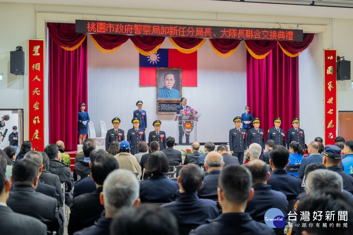 桃園市長張善政20日下午前往市府警察局,出席「桃園市警察局卸新任分局長、大隊長聯合交接典禮」。張市長期勉新任警政同仁能憑藉豐富經驗,持續提升治安作為,為市民打造安定宜居城市。