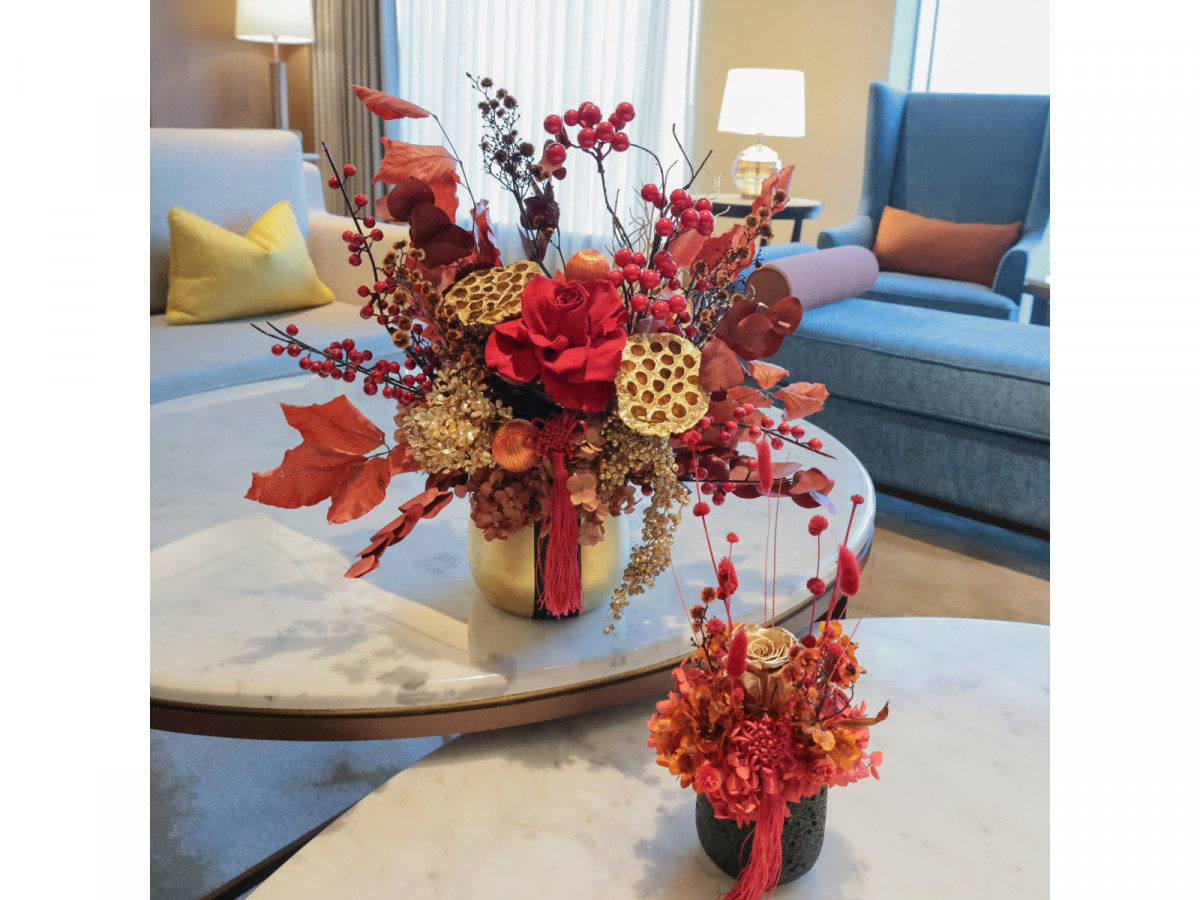 「永生花盆系列」則選用永生繡球、義大利三毛櫸與進口永生玫瑰為主體,搭配金色尤加利葉、紅色兔尾草與金色蓮蓬等細節,層層堆疊出富貴繁盛的視覺效果,並可提供客製訂做,價格介於 1,800 元至 8,800 元。