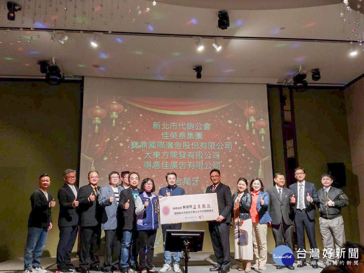 新北市不動產代銷經紀商業同業公會日前於新板希爾頓酒店舉辦2026聯合尾牙,會中特別響應新北市好日子愛心大平台,由不動產公會捐贈30萬元,另佳榮泰廣告公司也贊助10萬元,合計40萬元善款支持「新北市家外安置兒少支持服務計畫」。社會局副局長許秀能和地政局長汪禮國到場受贈,並代表侯友宜市長回贈感謝牌表達謝意。