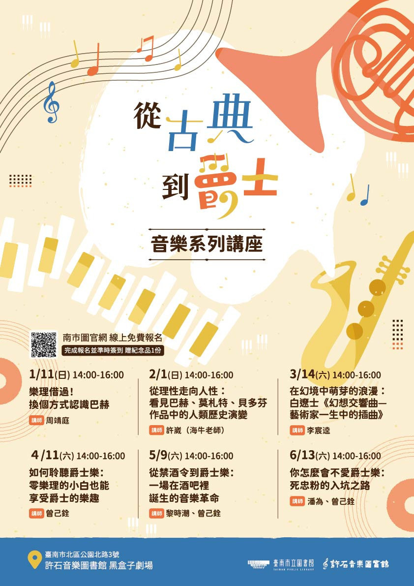 臺南市立圖書館許石音樂圖書館主辦的《從古典到爵士》音樂系列講座,集結古典與爵士領域的重量級音樂工作者,自1月起於黑盒子劇場登場,帶領市民展開一場橫跨時代的音樂之旅。