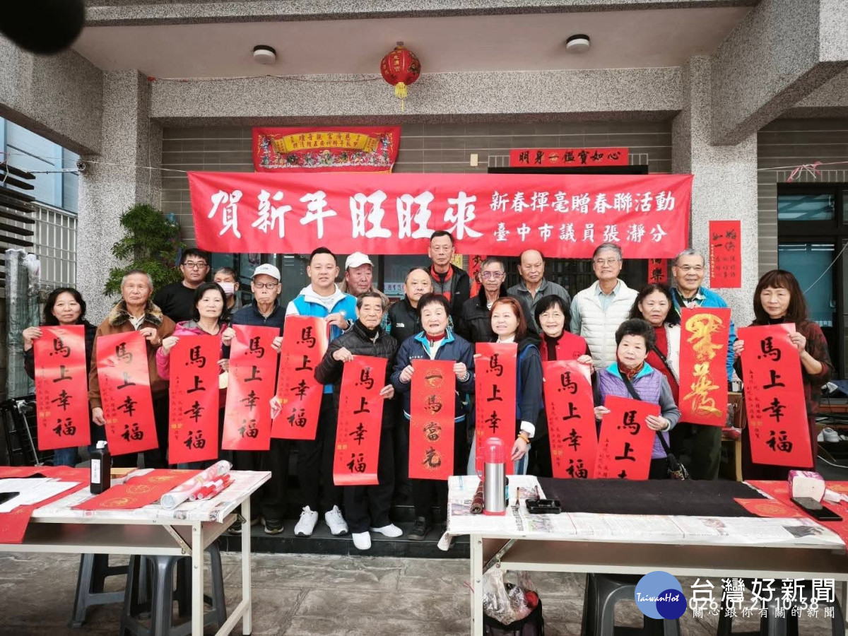 一馬當先、馬到成功!台中市議員張瀞分服務處21日上午舉辦新春揮毫贈春聯活動,邀請多位書法老師免費幫民眾寫春聯,吸引很多鄉親熱情參與,立法院副院長江啟臣也來發送「馬上幸福」春聯,氣氛熱鬧。