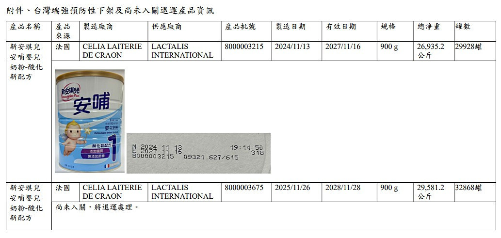 食藥署表示,昨(21)日晚間接獲端強實業股份有限公司(後稱端強公司)自主通報2批「新安琪兒安哺嬰兒奶粉-酸化新配方」產品[批號:8000003215、8000003675(尚未輸入)],因法國供應商拉克達利斯(LACTALIS INTERNATIONAL)無法排除使用到可能受源自仙人掌桿菌物質污染之原料,故啟動預防性自主下架,並提供退換貨處理專線︰0800211807,相關產品資訊如首圖所示。