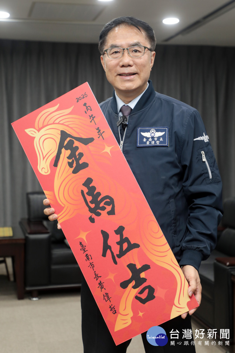 農曆新年將至,台南市長黃偉哲以「金馬伍吉」作為賀詞,向市民朋友拜早年,祝福大家在新的一年「金錢滿屋、馬到成功、五福臨門、吉祥滿門」。