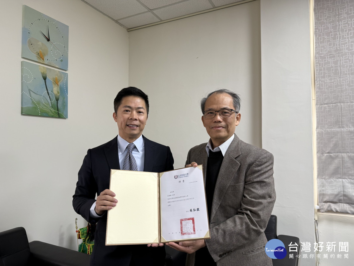 弘光科大校長蘇弘毅(右)頒發聘書給世界傳奇跑者、運動創業家林義傑(左)。