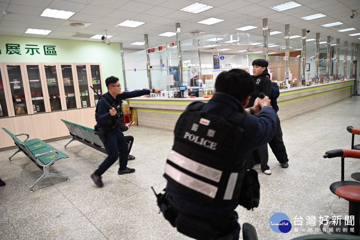 農會行員臨危不亂,一邊安撫歹徒情緒,一邊把握時機啟動警報系統,楊梅分局勤務指揮中心接獲通報後,立即調派警力趕赴現場,迅速部署優勢警力,成功制伏歹徒並安全救出人質,演練圓滿完成。