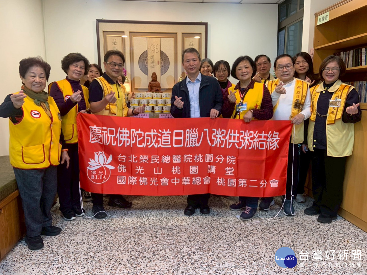 寒冬中,臺北榮民總醫院桃園分院佛堂再次傳出臘八粥香與祝福。115年1月26日,該院在病房大樓地下一樓佛堂舉辦「臘八贈粥」活動,由社工室協助聯繫宗教團體並串連社會資源,透過志工隊網絡連結,攜手國際佛光會中華總會桃園第二分會,為病患、家屬及到院民眾送上熱騰騰的臘八粥與應景春聯,讓寒冬中的醫院洋溢濃濃暖意。