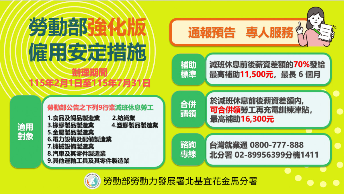 為協助因產業景氣波動而實施減班休息的勞工穩定就業,勞動部於114年8月13日公告實施強化版「僱用安定措施」,並考量部分產業仍面臨經營壓力,進一步公告自115年2月1日起延長辦理期間至115年7月31日。勞動力發展署北分署透過「通報預告」、「專人輔導」及「速審速撥」三大服務,協助轄區企業與勞工在減班期間穩定收入、安心就業。