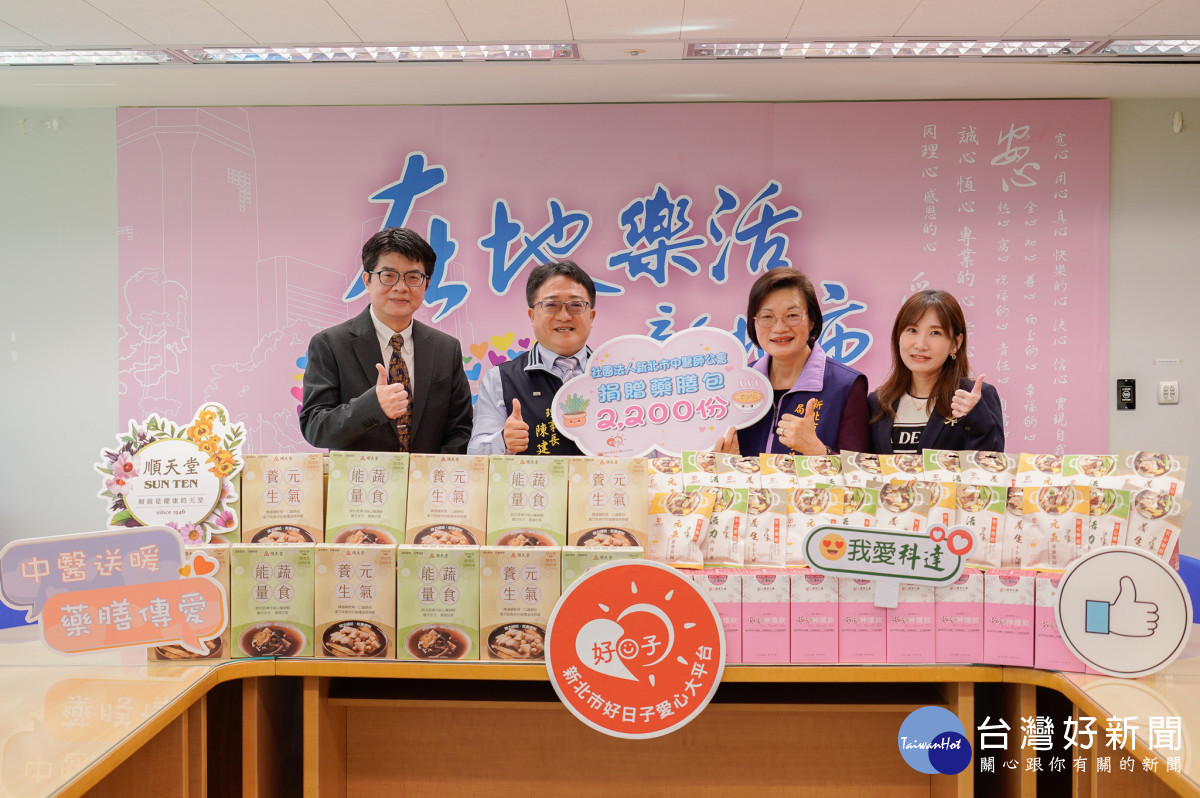 新北市中醫師公會今(29)日結合科達製藥公司及順天堂藥廠,捐贈2,200份的藥膳包,包含養生十全大補湯及玫瑰神纖飲等。這是公會從106年起每年持續的善舉,至今已累計捐贈超過萬包,市值合計220萬元。社會局長李美珍回贈感謝牌,並感謝公會及兩家藥廠持續送愛,讓弱勢家戶暖胃又暖心。