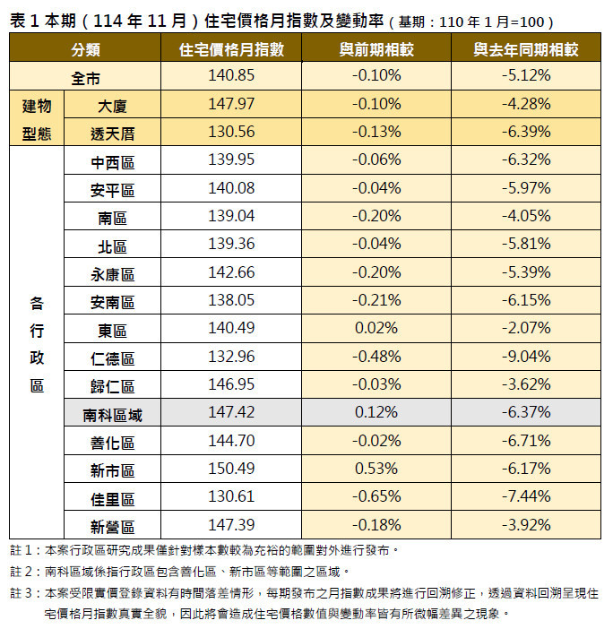 南市114年11月住宅價格指數微降 南科與沙崙綠能科技廊帶交易量續增