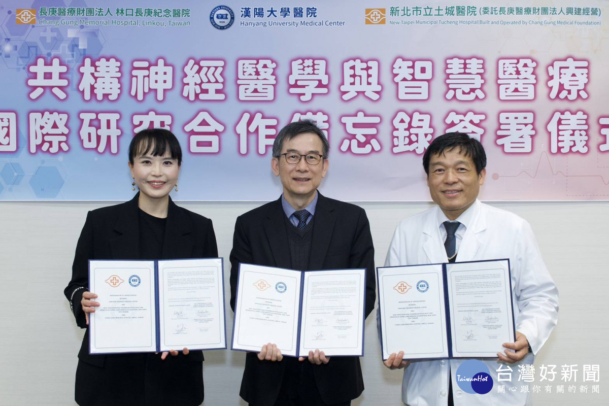 新北市立土城醫院、林口長庚紀念醫院與韓國漢陽大學醫院(Hanyang University Medical Center)今(30)日正式簽署國際學術合作備忘錄(MOU),三方共同建立具制度化與長期性的跨院、跨國研究合作機制,聚焦神經科學、神經退化性疾病、腦影像分析及人工智慧輔助診斷等前瞻研究領域,深化基礎研究與臨床轉譯的國際整合,開啟臺、韓神經醫學研究合作新里程。