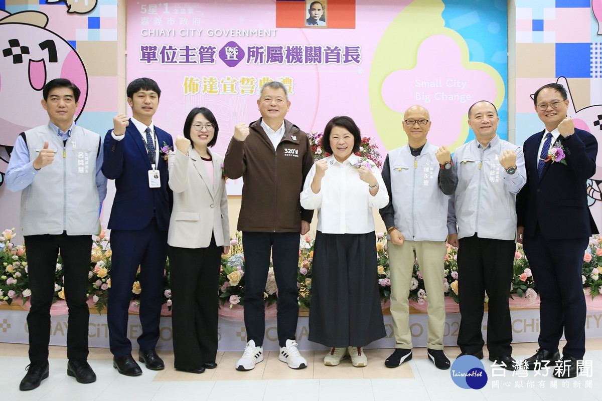 嘉義市府今天舉行新任勞工及青年發展處、企劃處處長及環境保護局局長聯合佈達宣誓典禮/嘉義市府提供