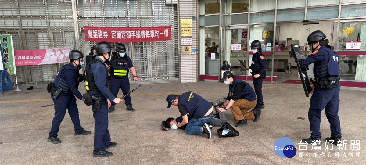 歹徒得手後欲離開現場時,遇到接獲通報抵達現場的員警,於銀行大門口與警方對峙,啟動快速打擊支援警力陸續到達,以絕對優勢警力迅速將持械搶匪制伏,藉由演練來強化金融機構員工緊急應變能力,並提升員警接獲報案時反應效能及逮捕現行犯的效率。