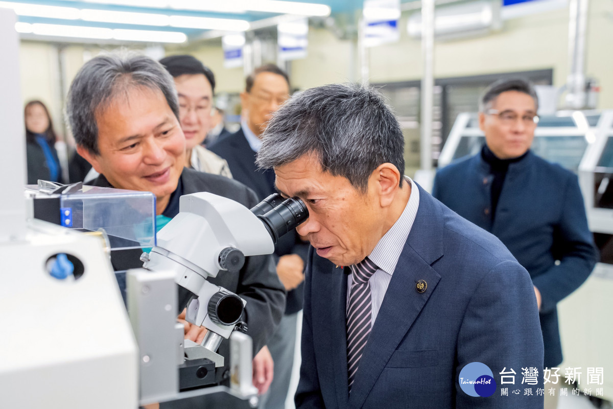 一關市市長佐藤善仁(前)於參訪過程中,聆聽明新科大副教務長高國檳(左一)介紹半導體實作教學設備與產學研發應用。