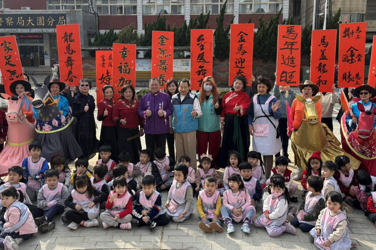 大園區長余誌松也親自入鏡,手持書法家李詩鐘所寫的「神馬」春聯,向鄉親表達感謝與祝福。他笑說,每年揮毫活動總是人潮滿滿,春聯幾乎「秒殺」,也感謝北健帶來錄影體驗與媒體識讀活動,讓年節活動更加豐富有感。