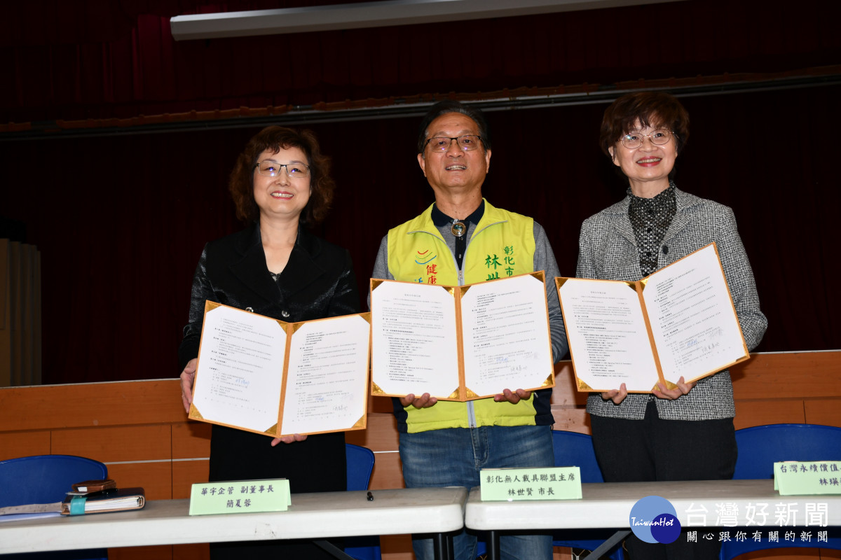 彰化無人載具聯盟主席林世賢市長與華宇企業管理顧問股份有限公司副董事長簡夏蓉(左)。圖/彰化市公所提供
