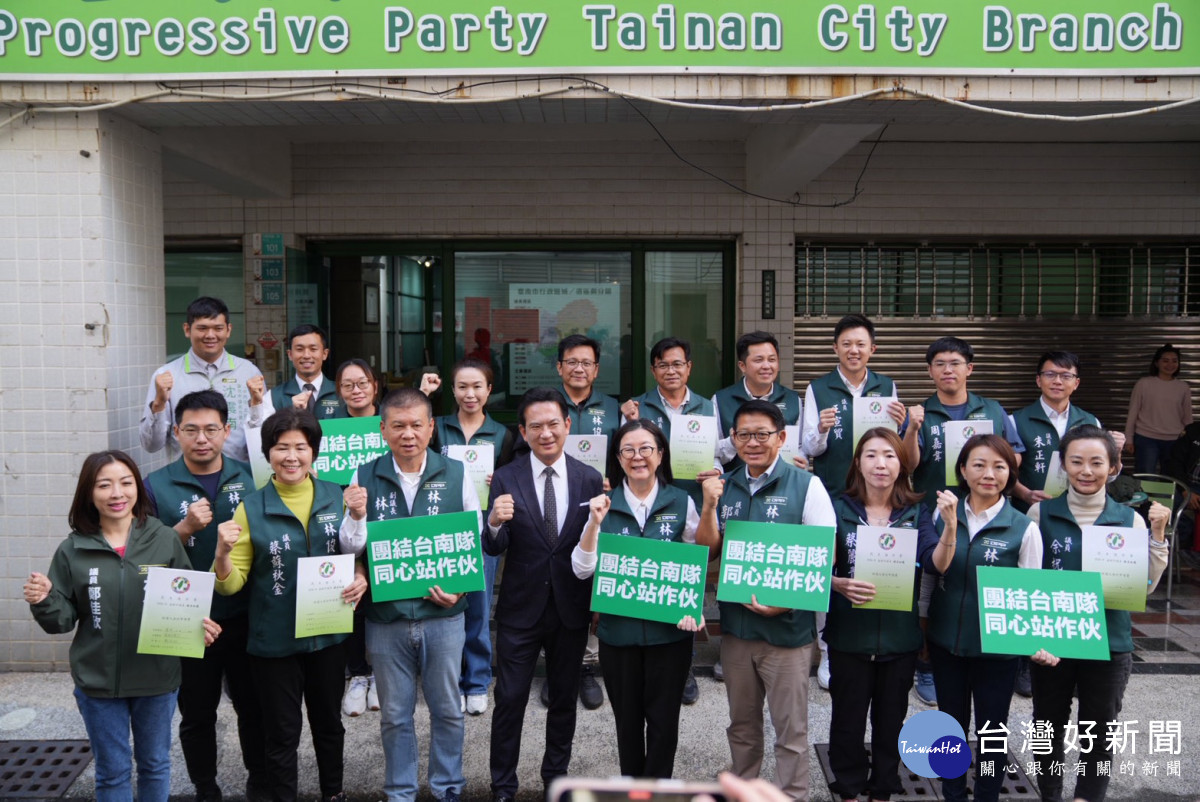 台南市議長邱莉莉、副議長林志展、民進黨團總召李宗翰、副總召沈家鳳、發言人鄭佳欣、余柷青、王宣貿以及蔡蘇秋金、謝舒凡、陳秋宏、蔡麗青、朱正軒、黄肇輝、沈震東弟弟沈震南、周嘉韋、林依婷、李啟維、蔡筱薇、郭鴻儀等各區議員,6日一同完成黨內參選登記,決定同心站作伙爭取連任。