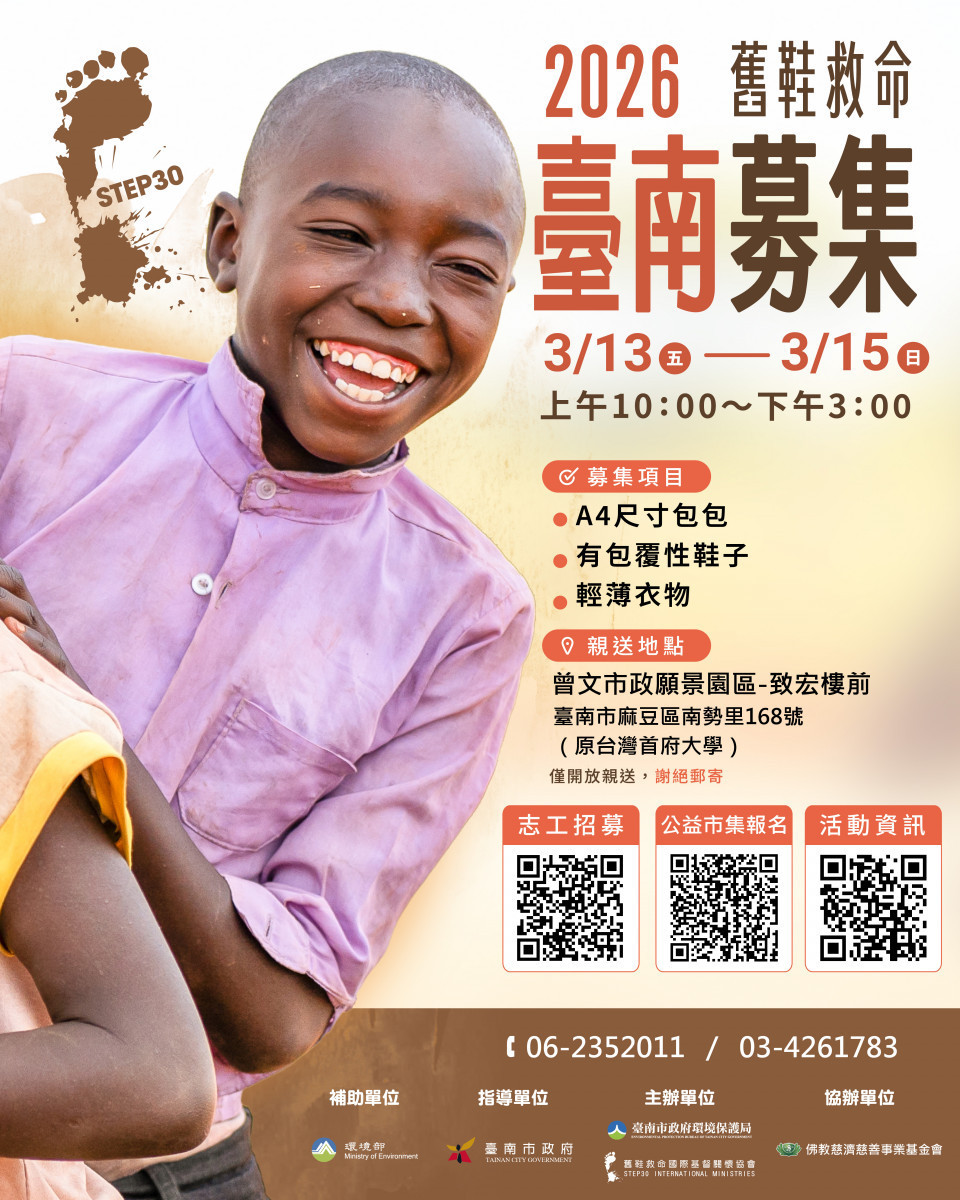 過年前大掃除,是否整理出一袋袋穿不下、少穿或久未使用的鞋子、衣物與包包?先別急著丟! 3月將有機會重新發揮價值。環保局將於115年3月13日至15日在曾文市政願景園區(原麻豆首府大學校區)舉辦「舊鞋救命-臺南募集活動」,募集堪用舊鞋、夏季衣物及可放入A4尺寸的包包送往非洲偏鄉,邀請市民把愛心留下來,讓物品延續生命、溫暖更多需要幫助的人。