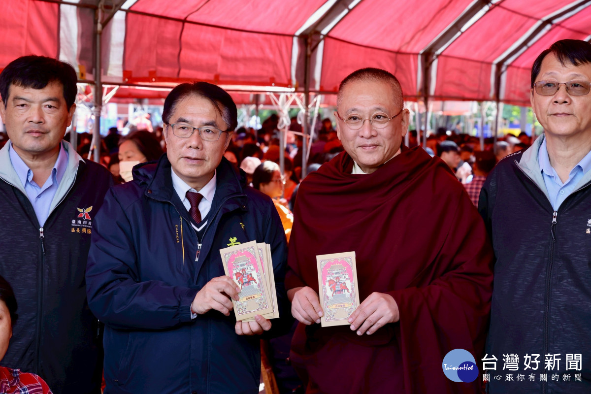 台南市長黃偉哲心繫弱勢團體,特到場致意及發放糖果給參與的親子,同時也與洛本天津仁波切共同發放參加者每人2000元福田金及毛帽、圍脖、手套,在寒冬中送上祝福與關懷,祈願眾人皆能在佛祖照看下身心安頓,脫貧邁向順境。